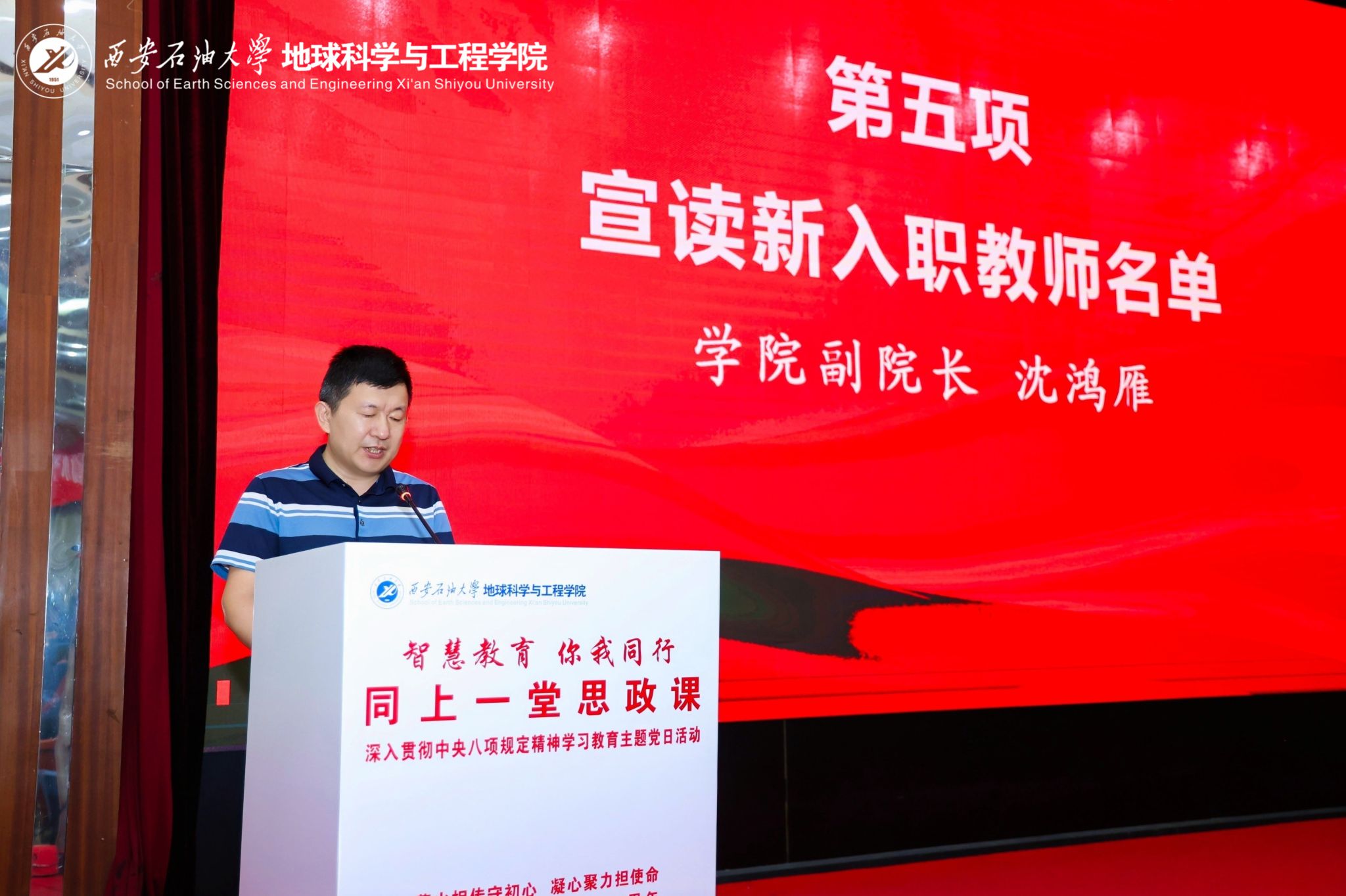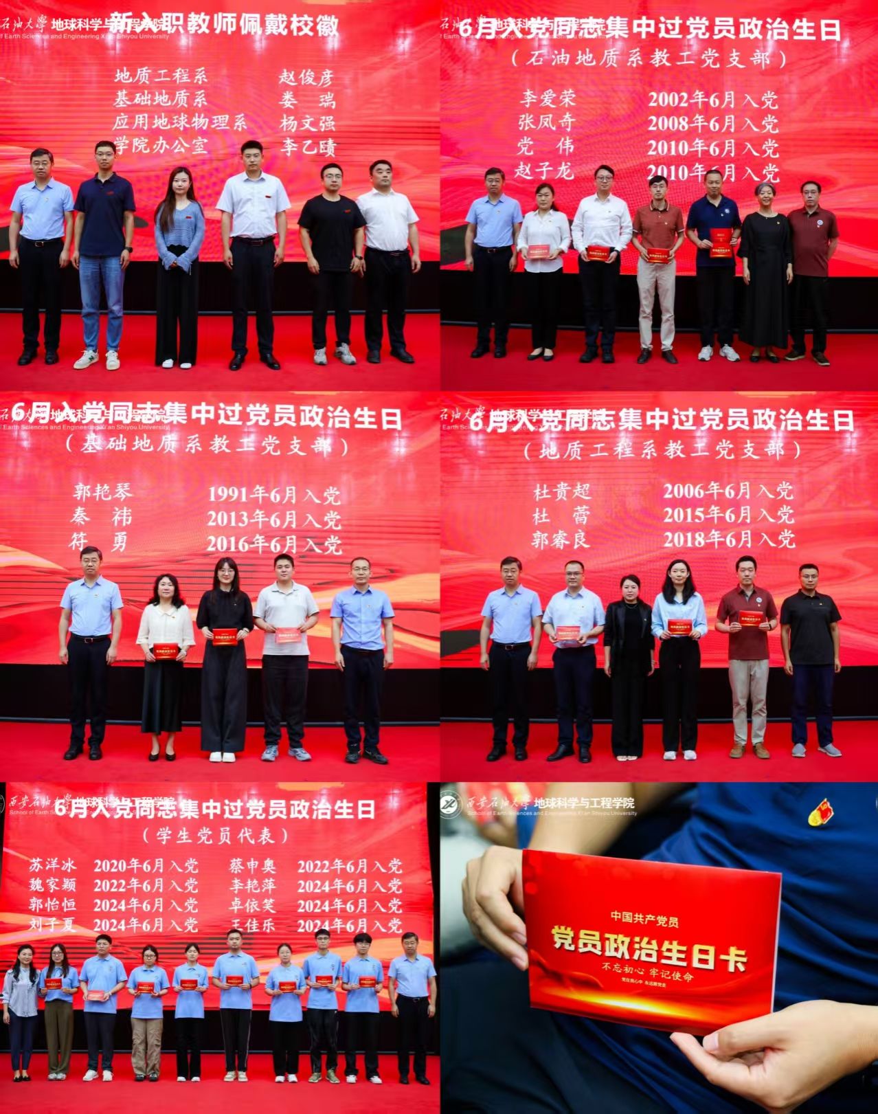公司副经理沈鸿雁宣读公司新入职教师名单。公司经理宋立军等与会领导为新进教师佩戴校徽,象征教育薪火相传。在集中过政治生日环节,校院领导与各系党支部书记、主任为6月入党的师生党员代表颁发党员政治生日卡,进一步强化身份认同,激发使命担当。