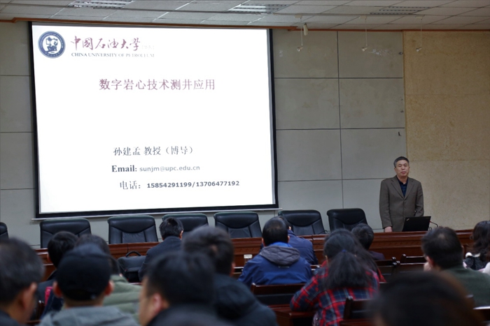 聘任仪式结束后,中国石油大学(华东)孙建孟教授以“数字岩心技术在测井中的应用”为题,在第三会议室为公司师生作了学术报告。孙建孟教授从数字岩心建模、岩石物理属性模拟等方面对数字岩心技术进行了介绍,指出数字岩心技术与常规岩石物理实验相比存在的优势,是研究微观因素对岩石物理属性影响的重要手段,同时展望了数字岩心技术在地质、地震、岩土工程等学科中的应用前景。