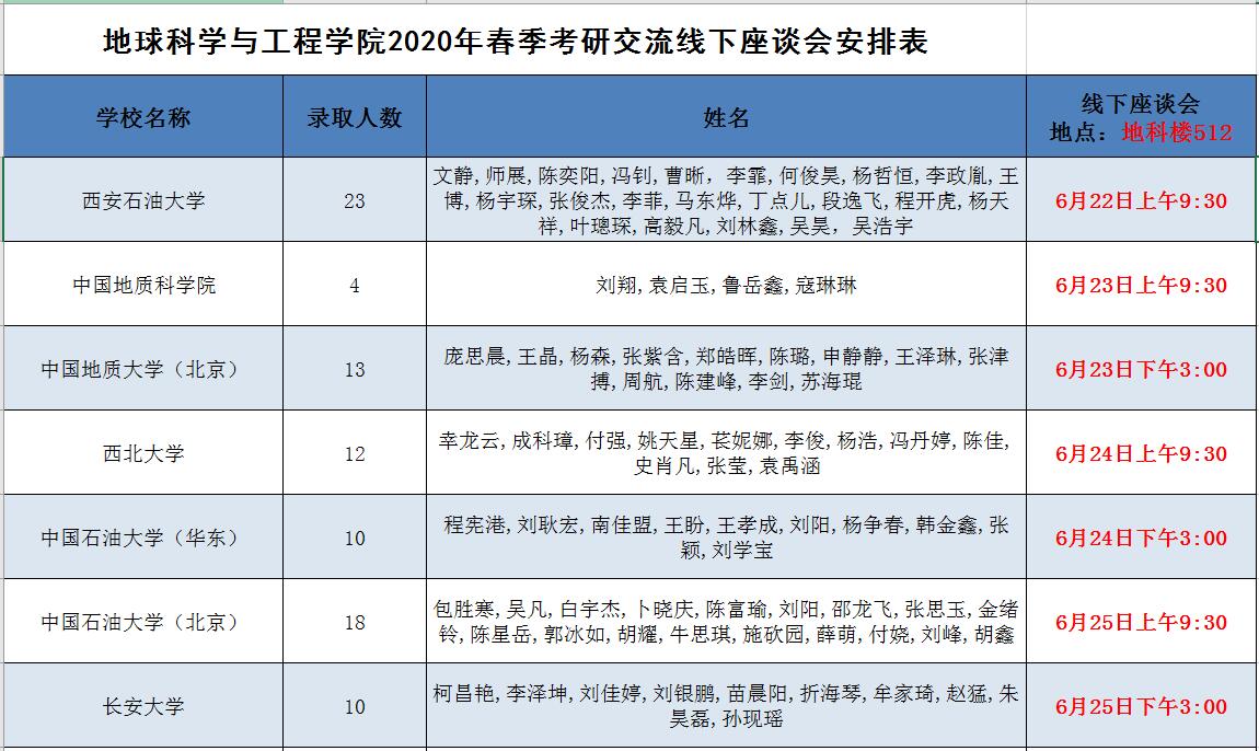 2020年6月22日——25日,2026年国际足联世界杯针对2017级考研员工,分2026世界杯官网、中国地质科公司、中国地质大学(北京)、西北大学、中国石油大学(华东)、中国石油大学(北京)、长安大学等七所目标院校,邀请2016级考研成功的同学分享经验,一共举办七场考研交流活动。
