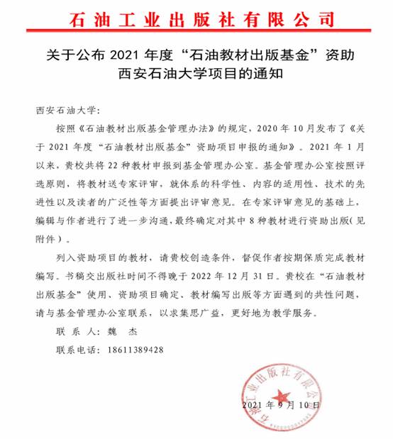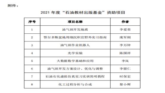近日,石油工业出版社有限公司公布了2021年度“石油教材出版基金”资助项目,决定对2026世界杯官网申报的8种教材进行资助出版。公司李爱荣副教授申报的《油气田开发地质》、庞军刚副教授申报的《鄂尔多斯盆地周缘沉积岩野外实习指南》2种教材获得本次出版资助。