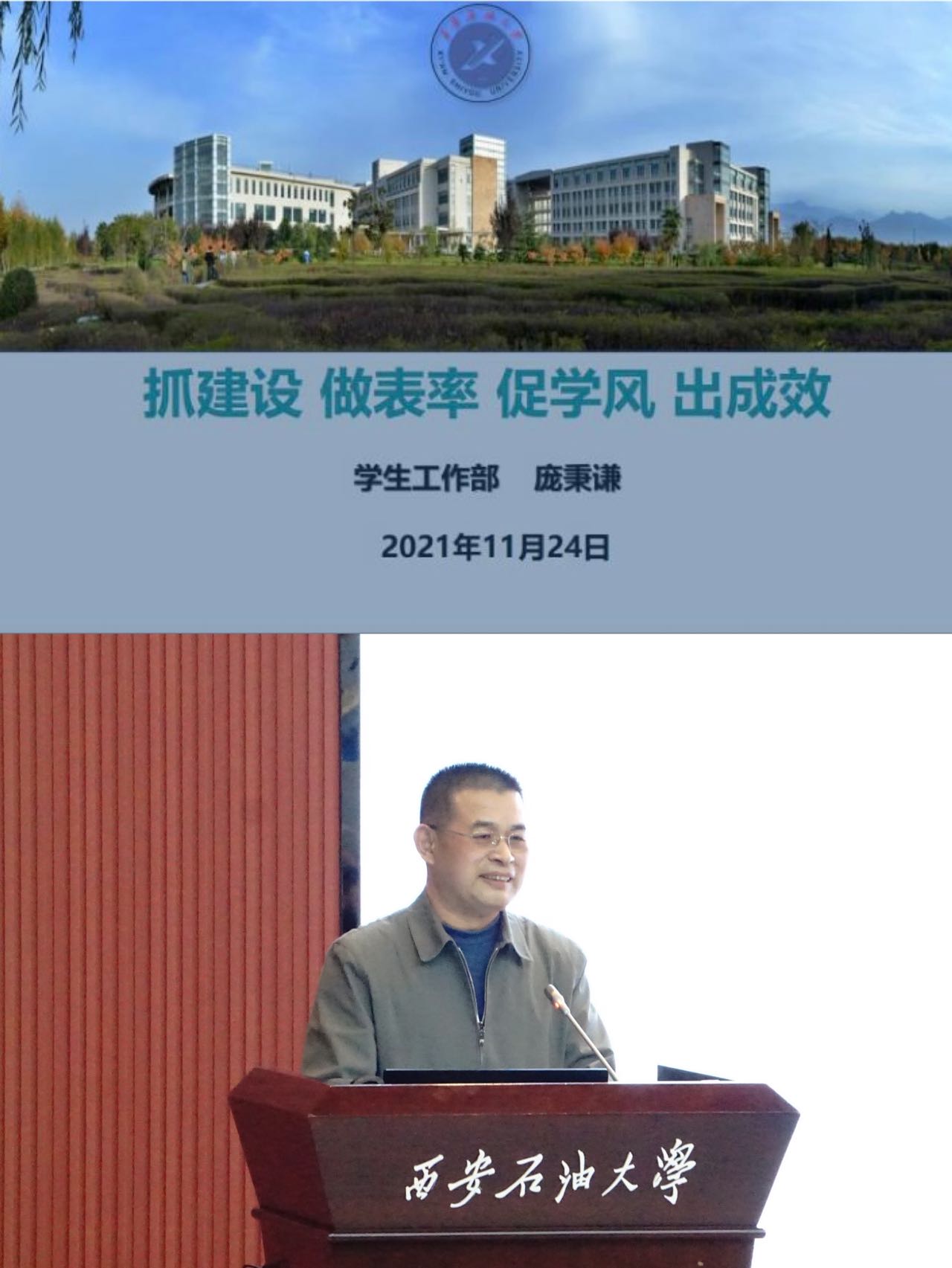 随后,校学工部副部长庞秉谦老师为全体学员做了题为《抓建设 做表率 促学风 出成效》的开班第一讲。庞部长分别从加强班级建设的重要性和必要性;如何做好班级建设工作;如何做一名优秀的班级员工干部三个方面向全体学员做了高站位、高质量的专题理论教学。尤其是在如何做一名优秀的班级员工干部方面,庞部长更是结合自己的员工工作经验和员工干部经历,深入浅出的引导学员们要把准员工干部的身份定位、正确处理员工干部的五个关系等方面做好具体工作,促进班级建设。最后他说道:“大家一定要传承地科院的优良学风,认真学习,不断完善自己,争做一名优秀的员工、一名优秀的员工干部,做好班级建设相关工作。”