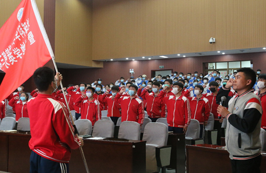 员工会主席靳兴同学带领全体学员面向班旗郑重宣誓,要坚定正确的政治方向,全心全意为同学服务。